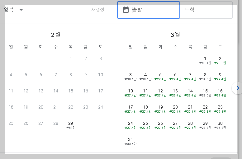 4) 출발, 도착 날짜를 입력해 주세요. 이때 달력창을 누르시면 각 날짜별 최저가 금액을 바로 알 수 있습니다.