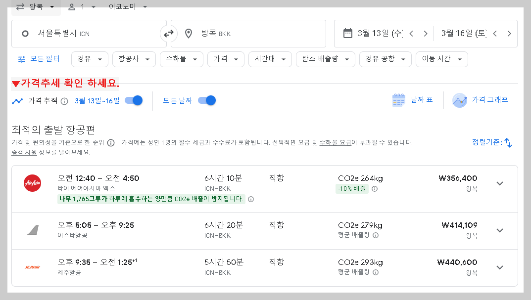 가격 그래프를 한눈에 볼 수 있기 때문에 내가 선택한 항공권이 비싼지, 저렴한지 체크할 수 있어요!