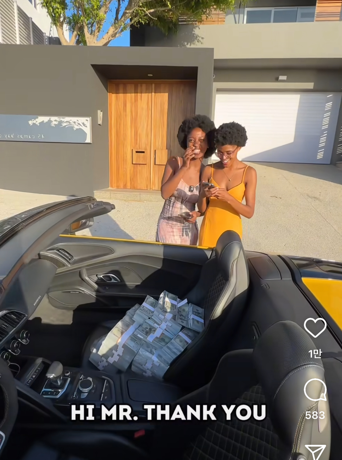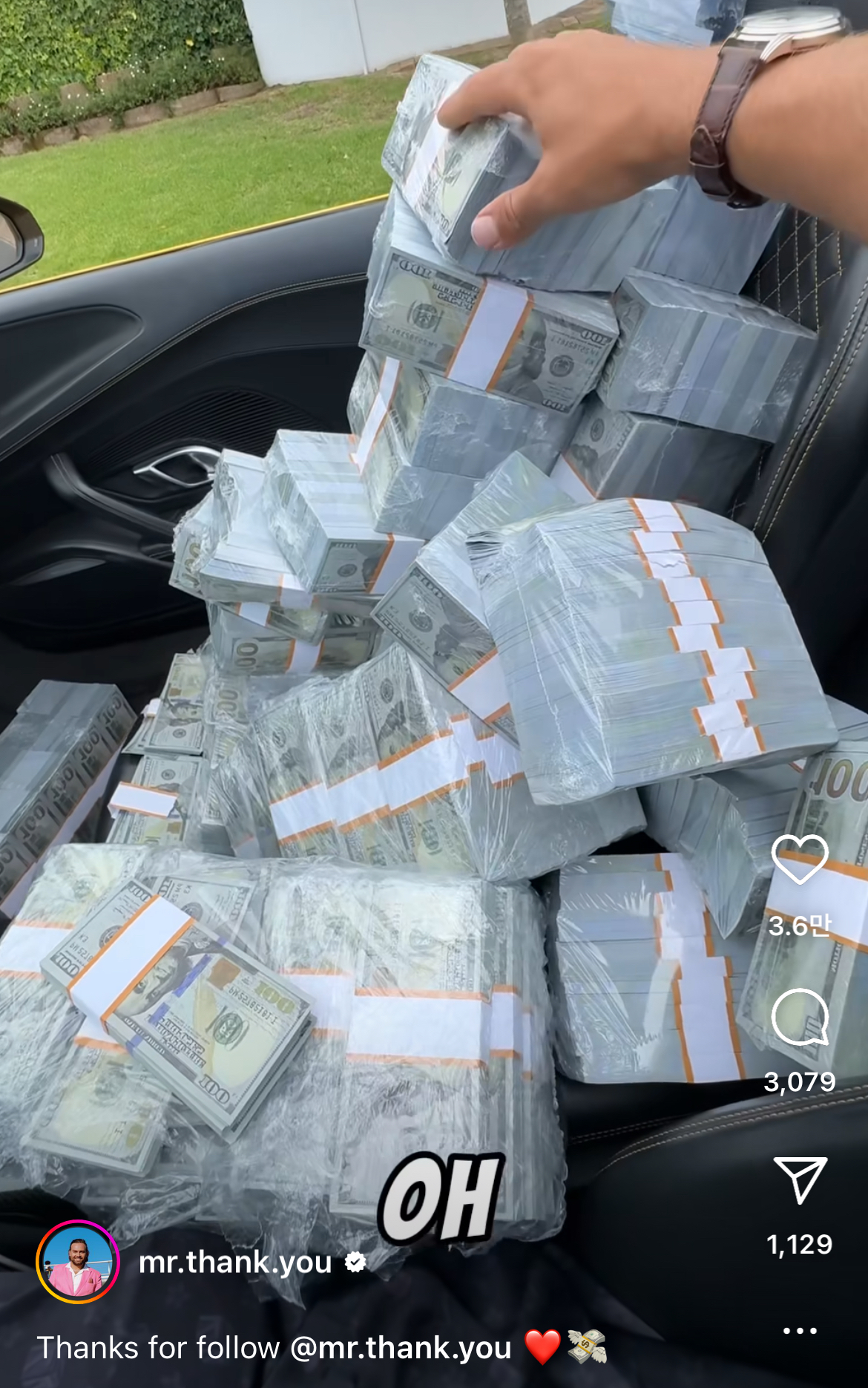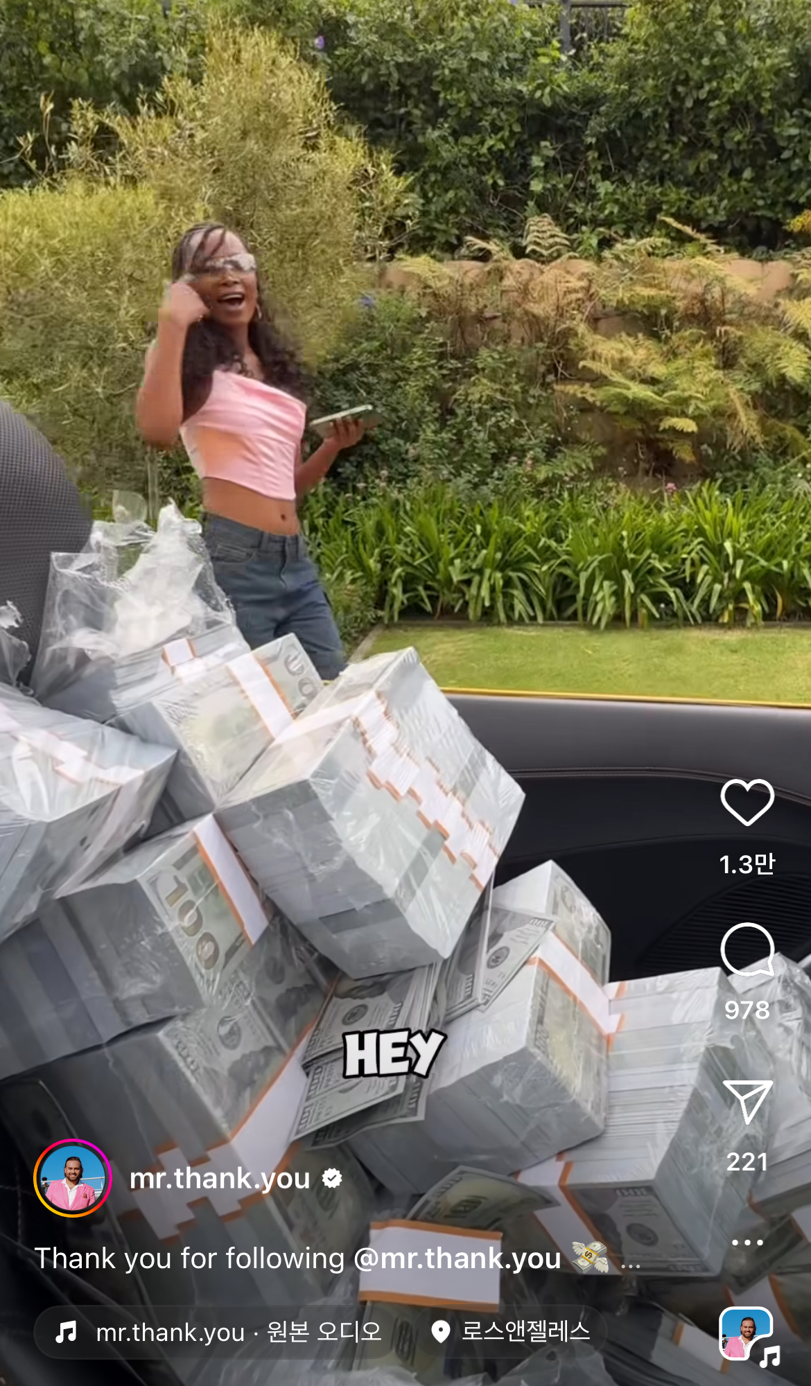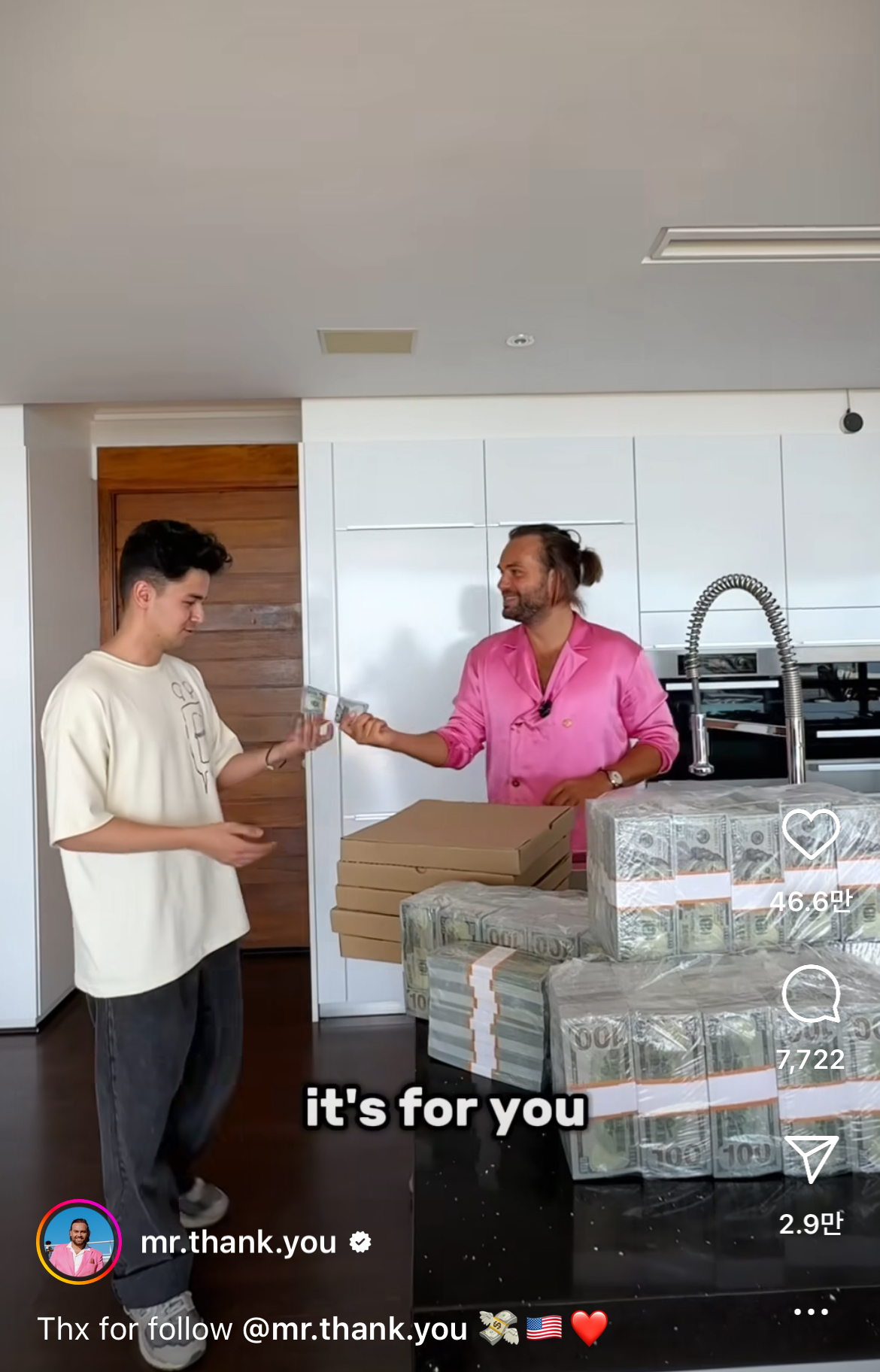 하면 미스터 땡큐가 그사람에게 백달러 한뭉치를 건넵니다.