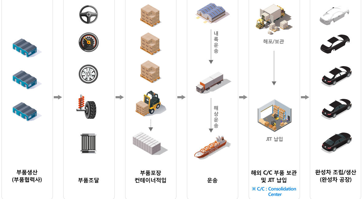 부품생산 (부품협력사) → 부품조달 → 부품포장 컨테이너 적입 → 운송 → 해외 부품 보관 및 납입 → 완성차 조립/생산