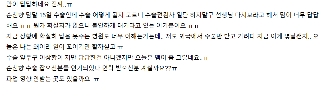 대학병원 가보신 분들은 잘 아실 거예요. 수술 스케줄 잡는 것이 얼마나 힘든 일인지. 그리고 그 일정 변경은 의사 스케줄에 거의 맞춰지기 때문에 환자들이 맞춰야 한다는 거.